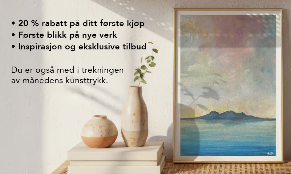 Hver måned trekker jeg en heldig vinner av månedens kunsttrykk i størrelse 30 × 40 cm. Vinneren kontaktes på e-post og annonseres på denne siden. Premien inkluderer fri frakt innen Norge, men ramme er ikke inkludert.